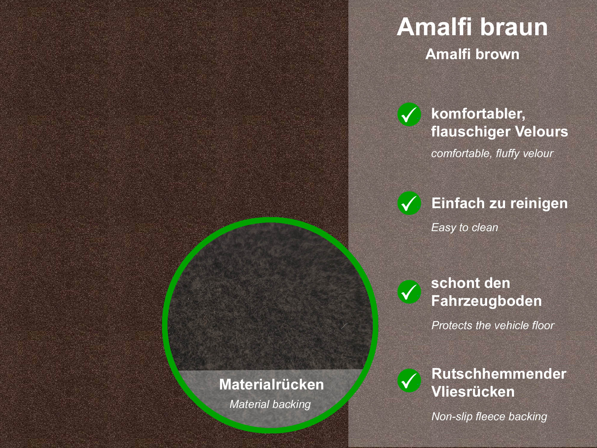 De kwaliteit van wonen. Amalfi is een pluizig velours dat echt wordt gebruikt voor woonruimtes. Het Amalfi materiaal maakt uiteindelijk indruk met zijn hoge comfort, echte behaaglijke gevoel en is zeer gemakkelijk schoon te maken.